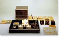 | 香道具: | 十種香箱(吉野山)、四種盤(競馬香)、千鳥薪絵桑香道具、硯(椿螺鈿) | |