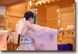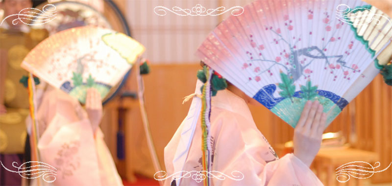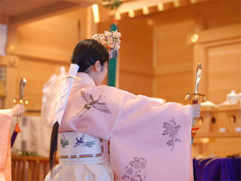 10、神楽奉納 鶴式の場合、奏楽に合わせて巫女が神楽を奉納します。